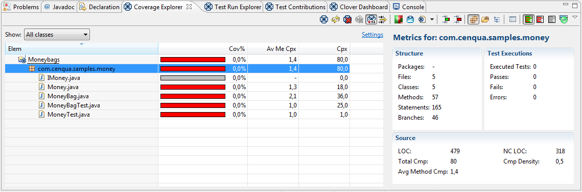 After running tests in a Clover-enabled project, on the left-hand side of this view you will see a tree of tests that were run. On selecting an element on the left-hand side, the right-hand side displays all the application (i.e. non-test) classes that had coverage caused by the selection.