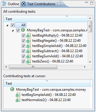 The Test Contributions view shows unit tests and methods that generated coverage for the currently opened and selected Java source file. As you switch between Java source file editors, the top most tree is updated with the test methods that contributed to coverage of this file. The bottom tree tracks the test methods that contributed to coverage of the file at the current cursor position.