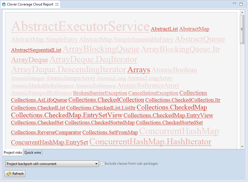 Coverage cloud report are a great way to work out the classes that form major risks (low coverage but high complexity) to your project and its packages, and also to highlight potential quick wins for increasing the overall project or per-package coverage. The coverage cloud report can be generated by right clicking on your Clover-enabled project in the Coverage Explorer view or Test Run Explorer view and selecting Generate Coverage Cloud.