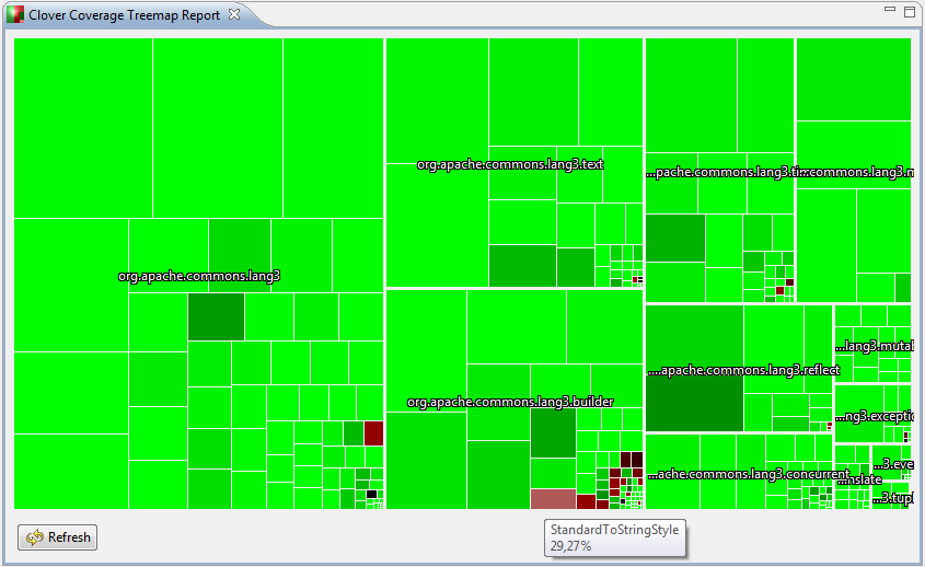 The coverage treemap report allows simultaneous comparison of classes and package by complexity and by code coverage. The treemap is divided by package (labeled) and then further divided by class (unlabeled). The size of the package or class indicates its complexity (larger squares indicate great complexity). Colors indicate the level of coverage (bright green - most covered, bright red - uncovered).