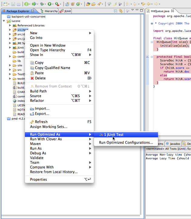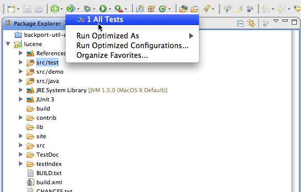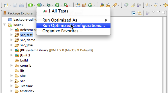 - Right-click on a folder or package containing test classes and select 'Run Optimized As: JUnit Test', OR