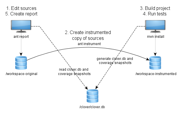 The diagram below shows how work with manually instrumented sources (Approach #1) can be organized. A location of Clover database is configured in Ant script.