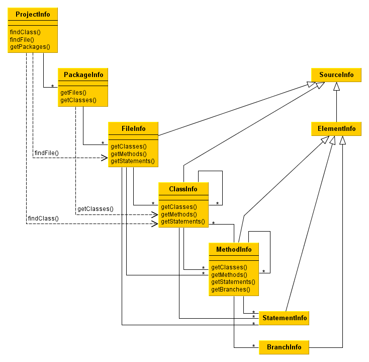 • basic entities stored in a database are represented by ProjectInfo, PackageInfo, FileInfo, ClassInfo, MethodInfo, StatementInfo and BranchInfo