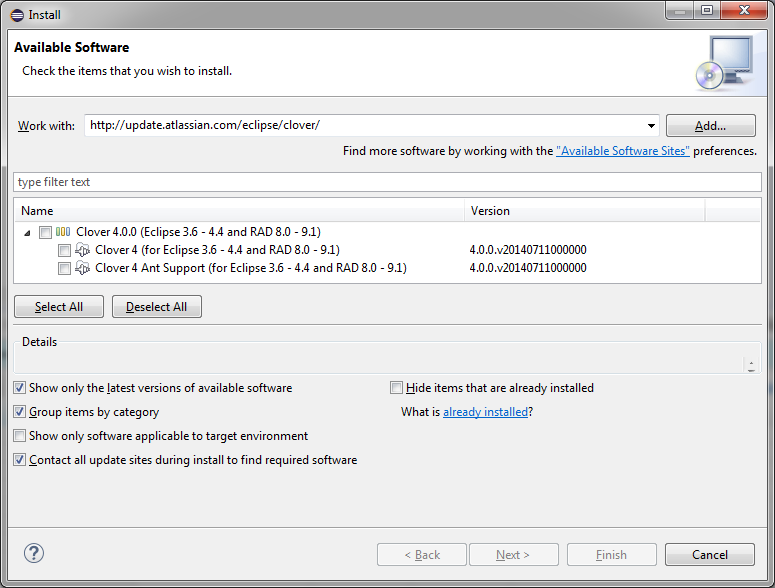 3. Select "Clover 4" and "Clover 4 Ant Support" features. Disable the "Contact all update sites..." checkbox (for faster installation). Click "Next" button twice.