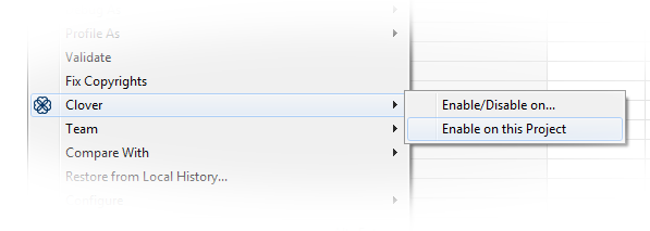 Right click on a project in "Package Explorer" view, select "Clover > Enable on this Project". If you wish to enable Clover for multiple projects at once, choose "Enable/Disable on...".