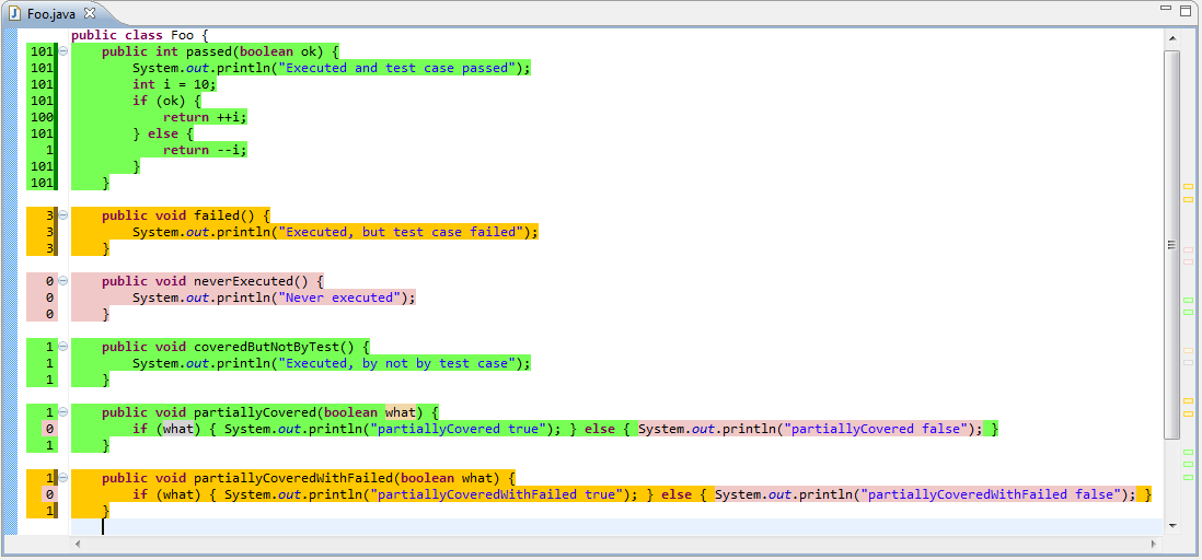 To view coverage information on a line-by-line basis, Clover adds colored annotations to your project's Java source code editors.