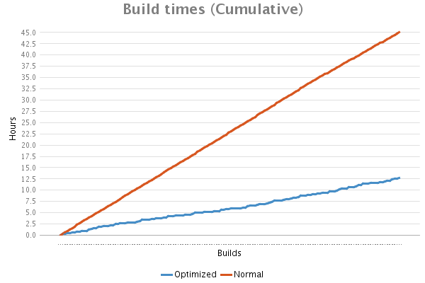 To see the benefits of Clover's Test Optimization, we have tracked build times on one Atlassian software development project. Over a 10 day period a development team committed 142 changesets as part of their ongoing development effort. For each changeset, two builds were triggered - a "normal" build, where all tests were executed, and a test-optimized build, where only relevant tests were executed. The following chart shows cumulative times for both the normal and test-optimized builds.