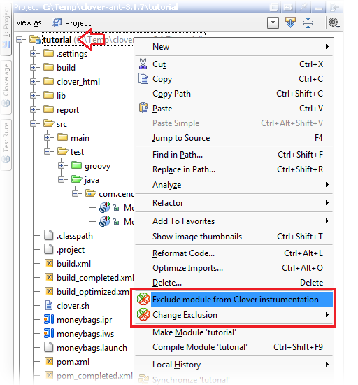 Right click on a module in Project view and select "Exclude module from Clover instrumentation" from context menu.
