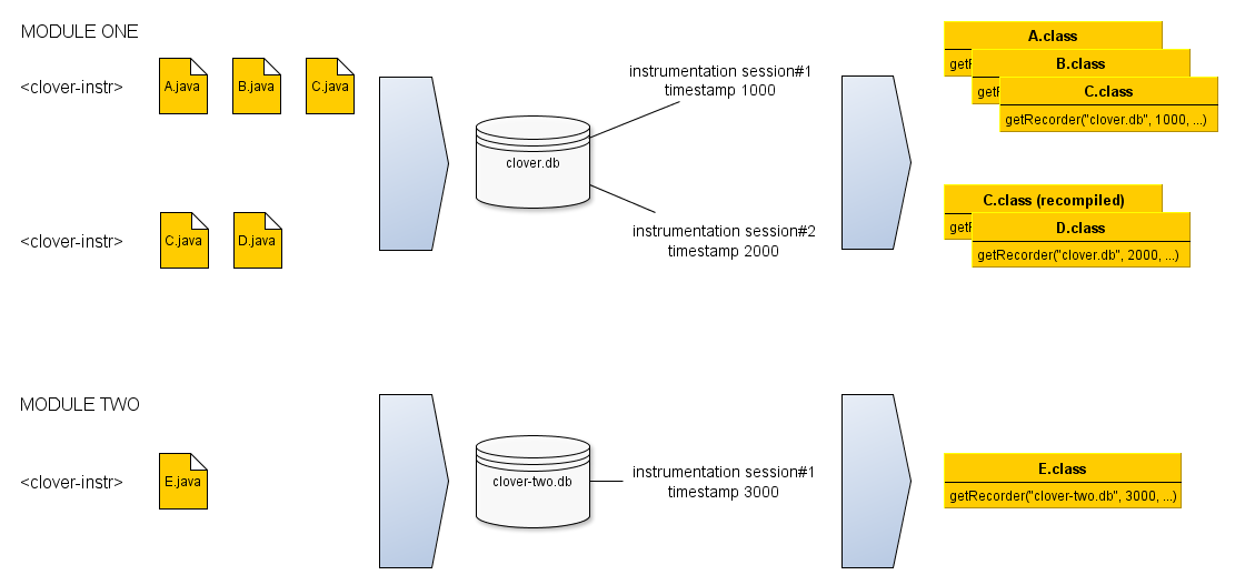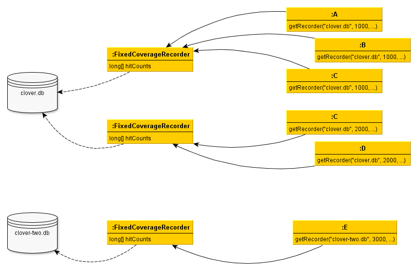 Every instrumented class is enhanced by adding code which requests a Clover's coverage recorder instance. Such coverage recorder getter is called with some arguments, which allows to determine which Clover database file and which instrumentation session in this file contains information about the class structure (like indexes of statements, methods, branches etc).
