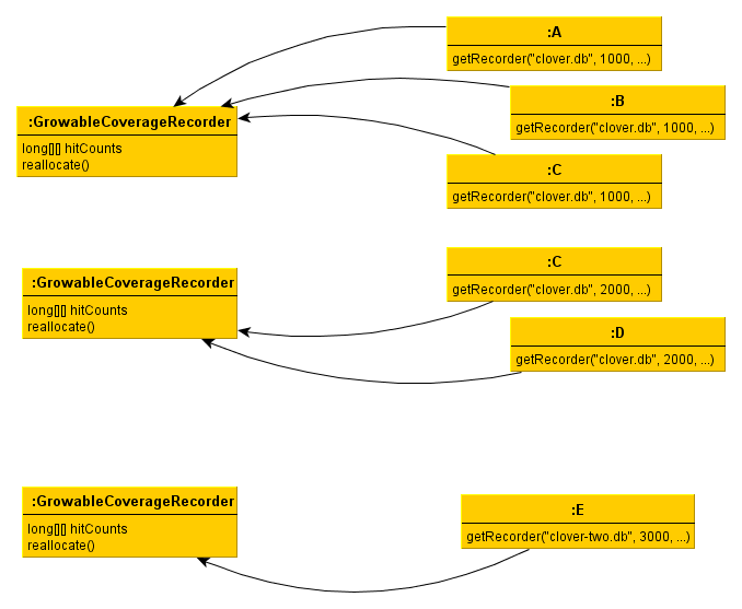 It's using a dynamically resizeable two-dimensional long[][1000000] array for recording hit counts for methods. Thanks to this it does not require access to the Clover Database at runtime and this is its main advantage. It's performance is slightly lower than the Fixed Coverage Recorder due to memory allocation and two-level indexing. All classes which were compiled in the same instrumentation session (i.e. within the same <clover-instr> or javac or groovyc call) will share the same instance of the coverage recorder.