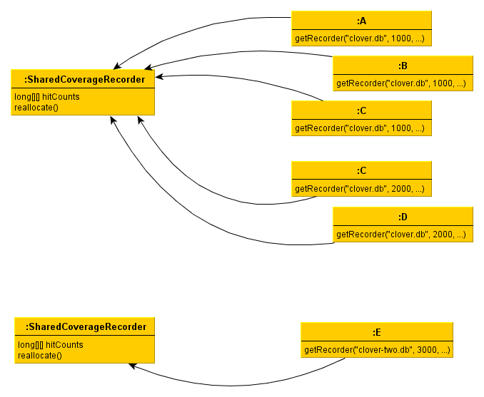 As project contains many classes, Clover has an optimization so that some of these classes will share the same coverage recorder instance - exact strategy depends on selected recorder type - see below.