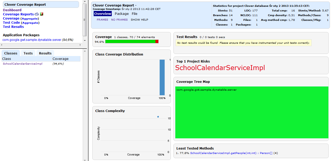 Open <project_dir>/clover/report/index.html file. You shall see a report like this: