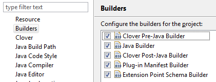 • add "Clover Pre-Java Builder" and "Clover Post-Java Builder" on Builders tab (in project properties); typically it looks like this: