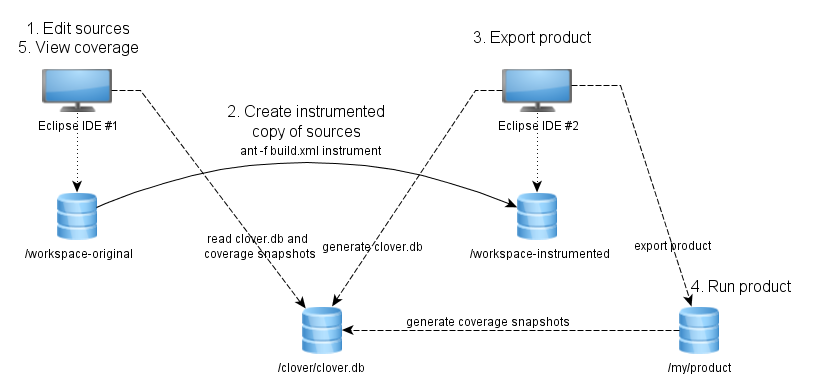 The diagram below shows how work with manually instrumented sources (Approach #1) can be organized. A location of Clover database configured in Eclipse IDE as well as in Ant script which instruments sources is the same and points to an absolute path. Thanks to this, after running product, coverage results can be fetched automatically into Eclipse IDE #1.