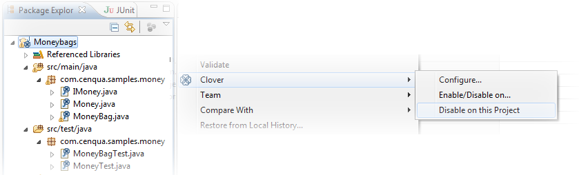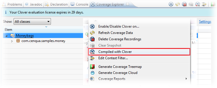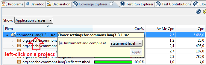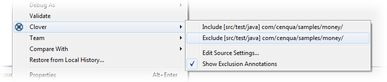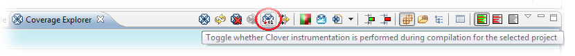 - selecting them in the Coverage Explorer or Test Run Explorer views and clicking "Toggle whether Clover Instrumentation..." button