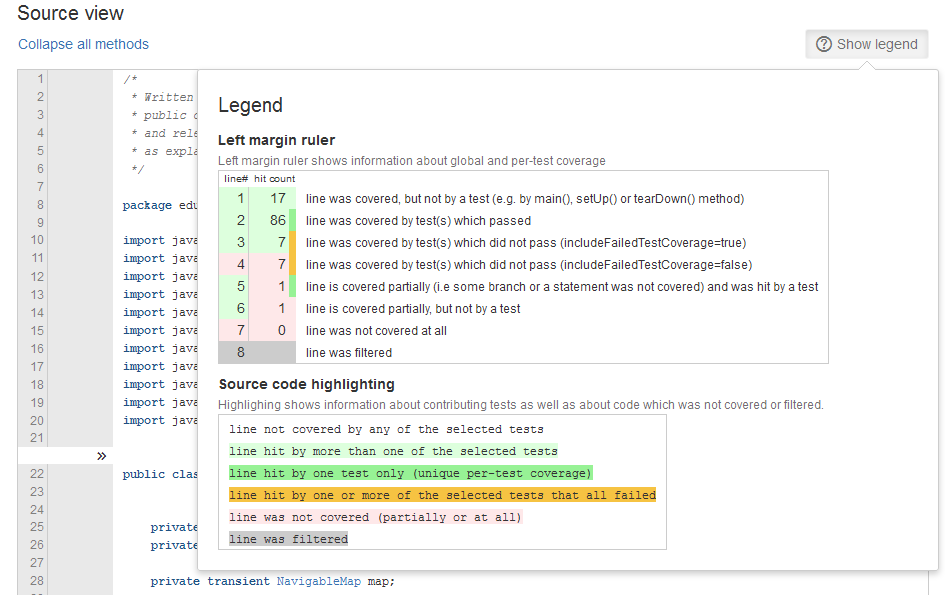 In Clover HTML reports, test coverage is indicated by the following color-coded legend.