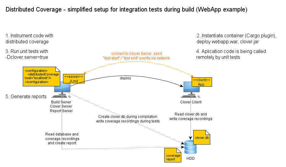 A project build has been configured with a distributed coverage feature in such way that the "Server" (i.e. the JVM where JUnits are launched) will wait until at least one "Client" (i.e. the JVM where business code is executed; in our case inside a Tomcat container) connects to it. Because of fact that our servlet classes will not be loaded by Tomcat class loader until first HTTP request comes, an extra MyServletContextListener class was created. This class does virtually nothing, but due to fact that it's being loaded by class loader during application deployment, the Clover initialization code bundled into this class will run and connect to "Server" on a specified port. As soon as connection is established, "Server" will start execution of unit tests.