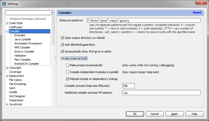 JetBrains IDEA 12.0 has a new compiler feature named "external build", which is enabled by default in project settings (File > Settings > Project Settings > Compiler > "Use external build" toggle). The IDEA 12 is supported since Clover version 3.1.8, however the support for "external build" feature is available since Clover version 3.1.12 and IDEA 12.1.1. For older versions, i.e. the combination of Clover 3.1.8-3.1.12 and IDEA 12.0.0-12.1.0 please keep the "external build" feature disabled.